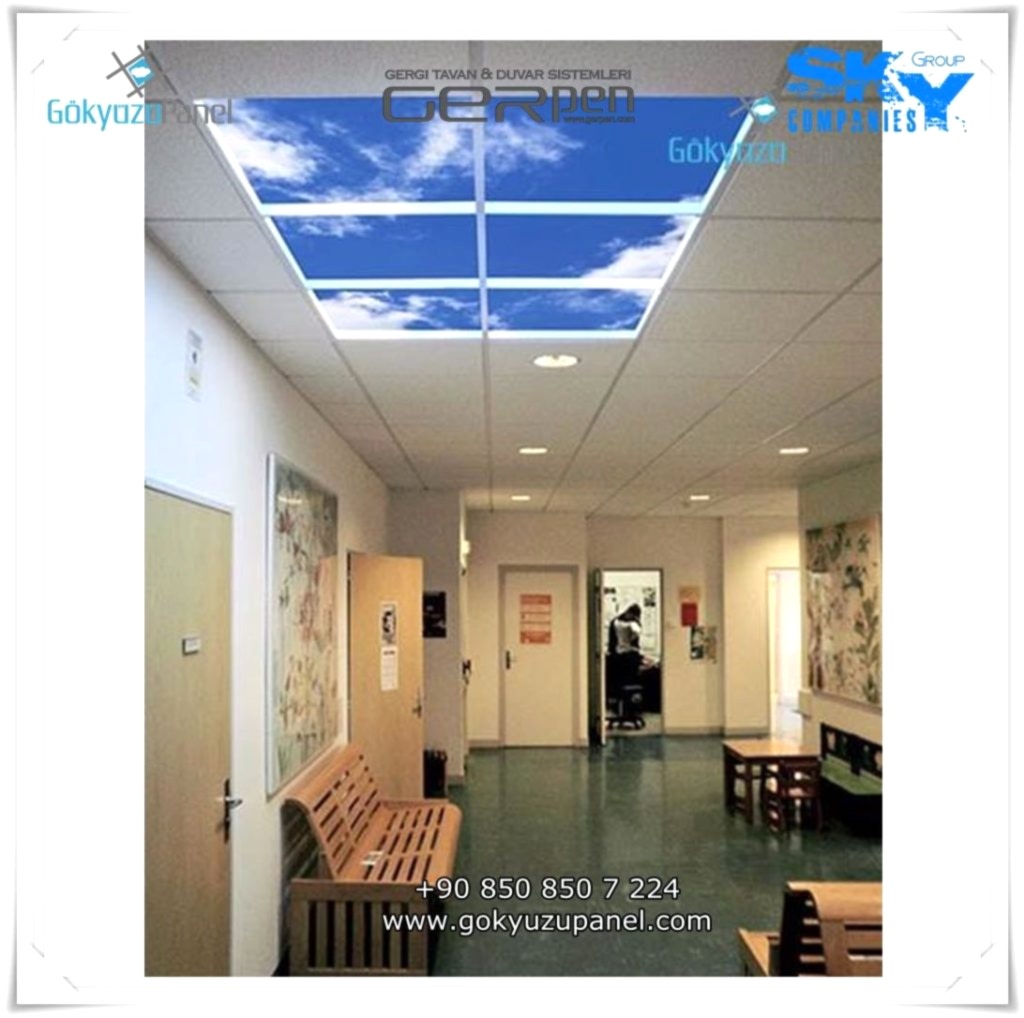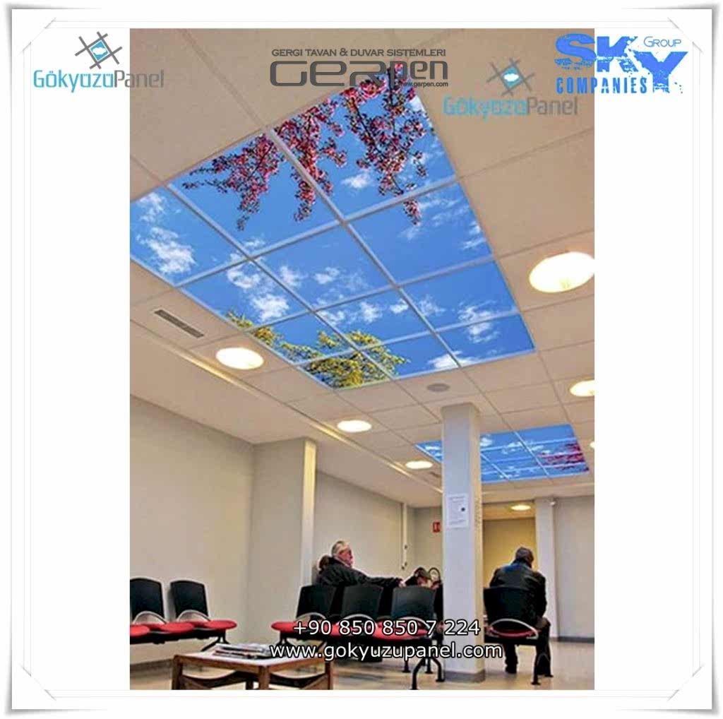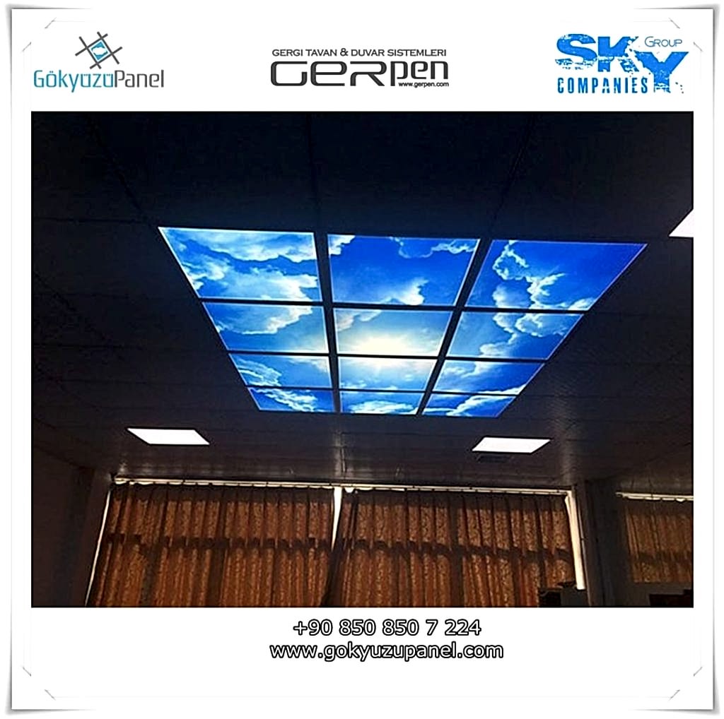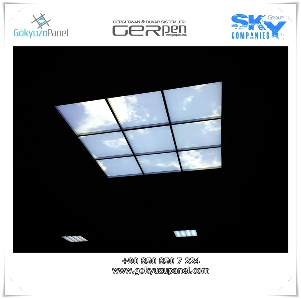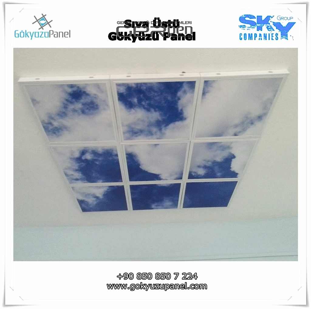Gökyüzü Panel ürünlerinde ise durum tamamen farklıdır. Mevcut T24 taş yünü asma tavan sistemlerine ( sıva altı ) birebir uyum sağlar. 60×60, 60×120, 30×30, 30×60, 30×120, 15×120 gibi uluslararası asma tavan panelleri standart ölçülerine sahiptir. T24 Asma tavan ızgarası olmayan bölümlerde yine kutu alçıpan ile oluşturulan tavanlarda da kolayca kullanılabilir. Led Panel yapısı benzeri iç yanlardan led aydınlatmalı, homojen ışık dağılımı sunar. Böylece ışığı her santim de eşit alırsınız. Pleksiglas ön yüzeyi ve istenilen her görselin baskısının yapılabileceği sağlam, özel ve kullanışlı ürünlerdir. Montajı son derece basit olan bu ürünler sadece elektrik bağlantısına ihtiyaç duyar. Desen ve görseller her panel de özel ve ayrı olabileceği gibi birbirini takip eden puzzle şeklinde de oluşturulabilir. Oluşan kareli, dikdörtgen, oval ve benzeri puzzle görüntüler yapılan aydınlatma ve dekorasyona daha estetik bir görünüm kazandırır. Kullanım esnasında herhangi bir sorun yaşandığı zaman sorunlu panel çok kolay bir şekilde yenisi ile değiştirilebilir. Mevcut mekandan taşınma gibi durumlarda paneller çok kolay bir şekilde tavandan alınıp taşınabilir, yeni mekanda kullanılabilir.
