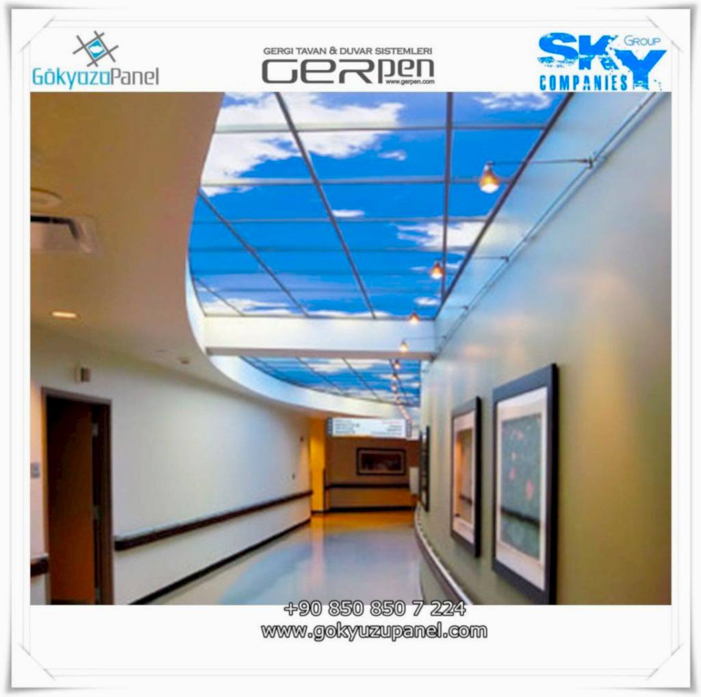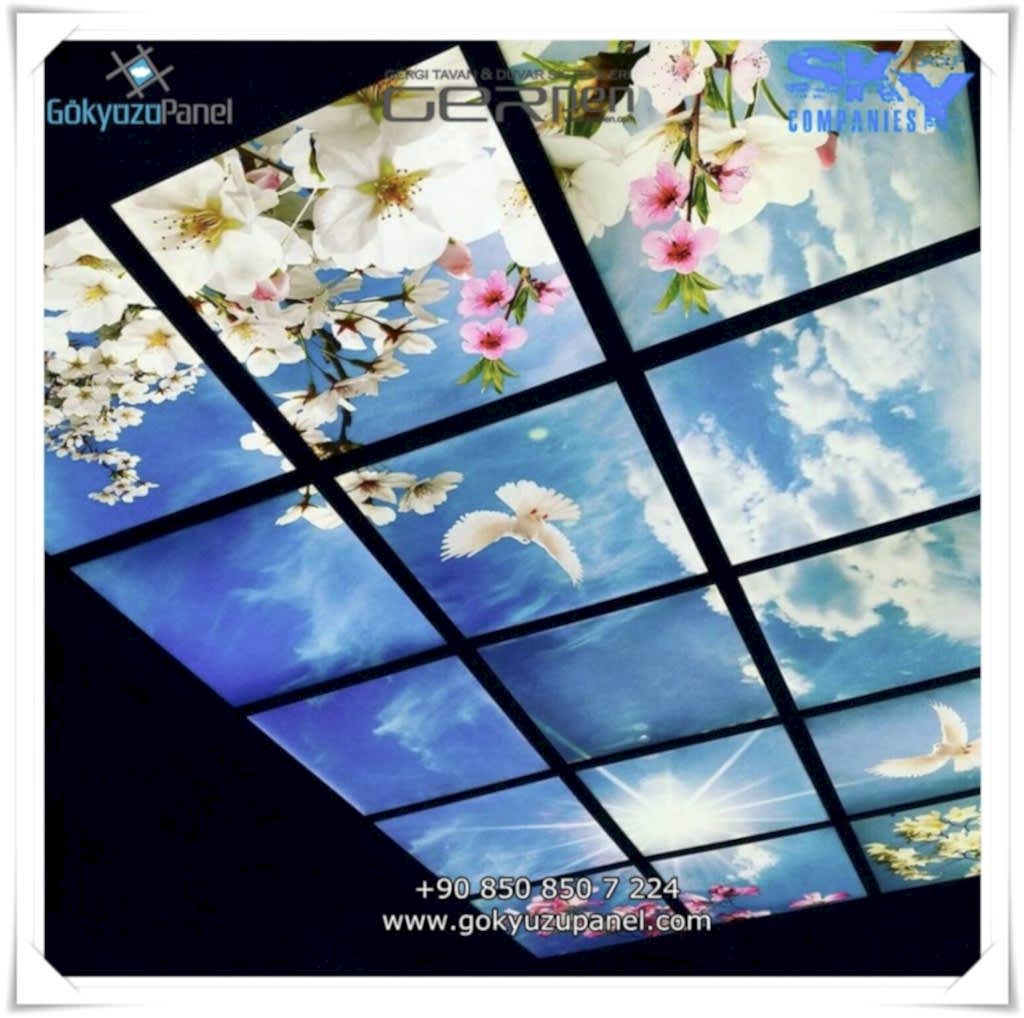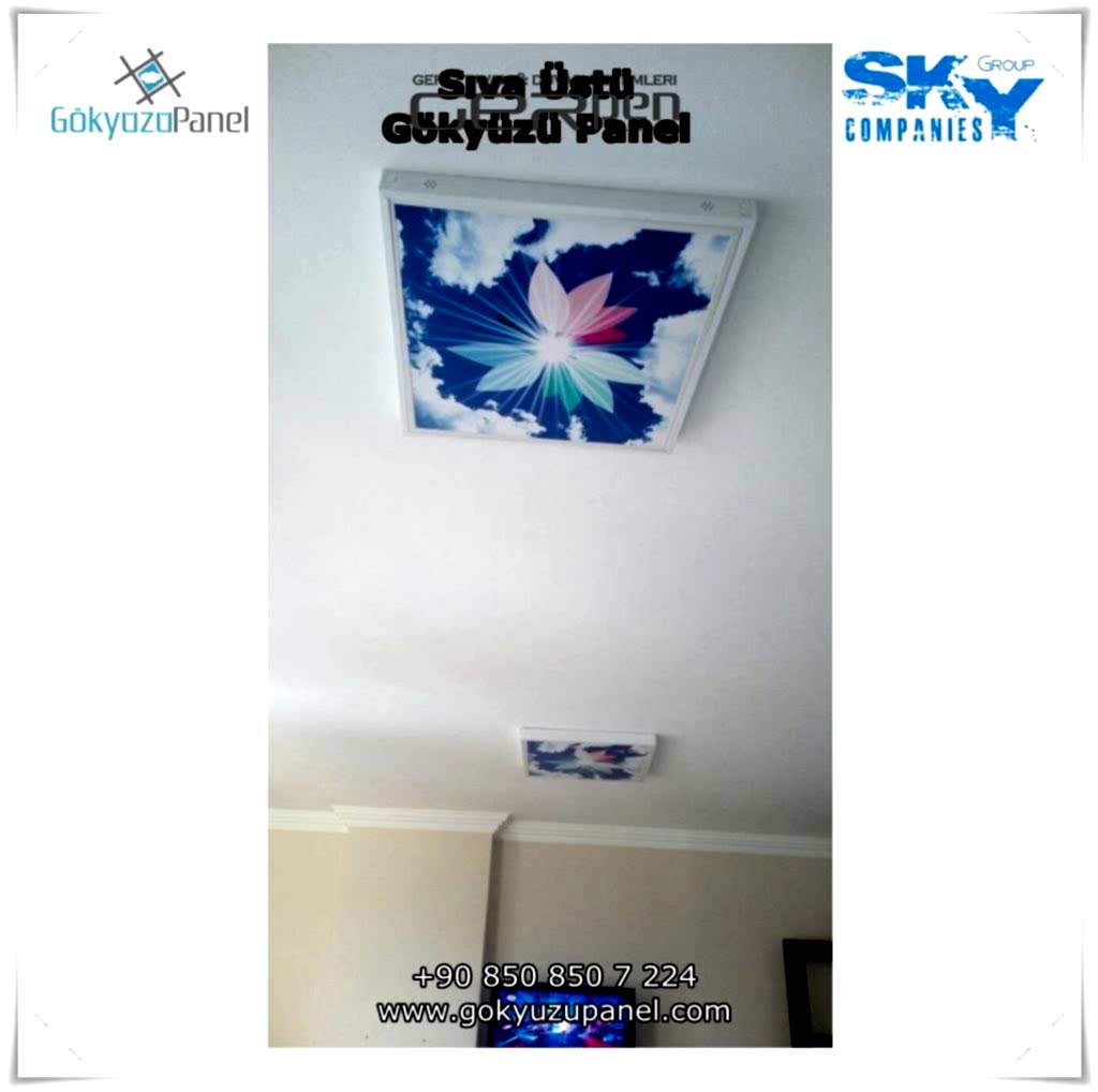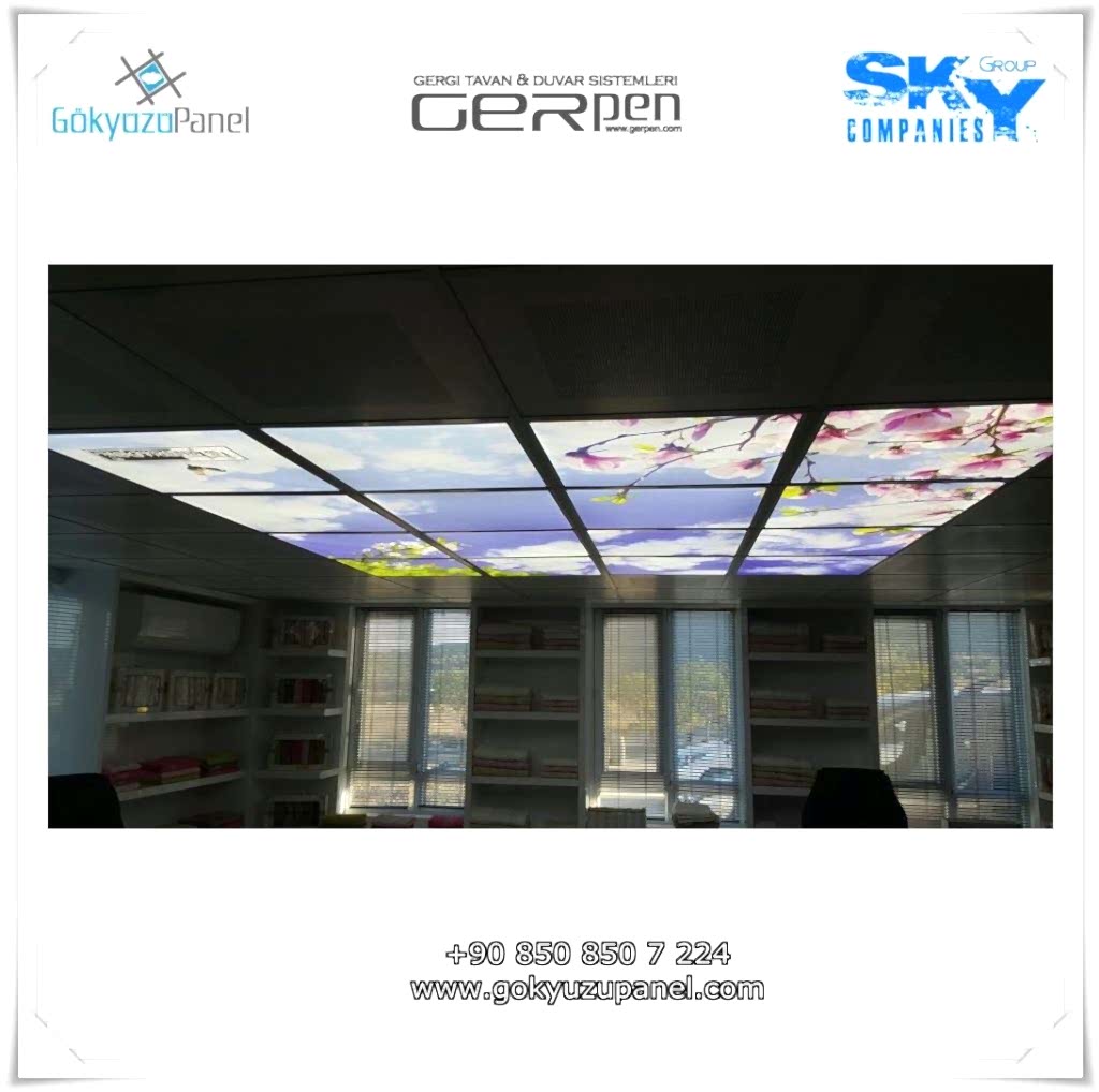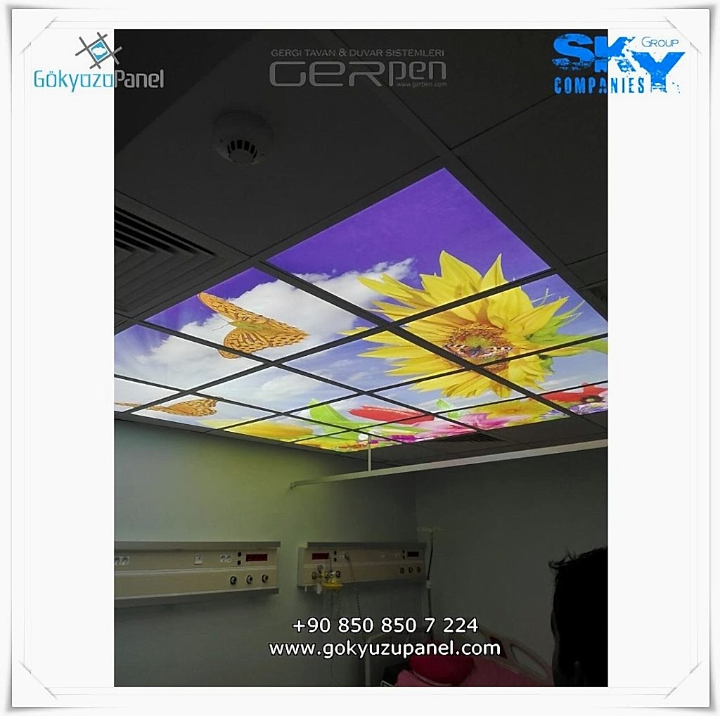 Gökyüzü Panel ürünlerinde ise durum tamamen farklıdır. Mevcut T24 taş yünü asma tavan sistemlerine ( sıva altı ) birebir uyum sağlar. 60×60, 60×120, 30×30, 30×60, 30×120, 15×120 gibi uluslararası asma tavan panelleri standart ölçülerine sahiptir. T24 Asma tavan ızgarası olmayan bölümlerde yine kutu alçıpan ile oluşturulan tavanlarda da kolayca kullanılabilir. Led Panel yapısı benzeri iç yanlardan led aydınlatmalı, homojen ışık dağılımı sunar. Böylece ışığı her santim de eşit alırsınız. Pleksiglas ön yüzeyi ve istenilen her görselin baskısının yapılabileceği sağlam, özel ve kullanışlı ürünlerdir. Montajı son derece basit olan bu ürünler sadece elektrik bağlantısına ihtiyaç duyar. Desen ve görseller her panel de özel ve ayrı olabileceği gibi birbirini takip eden puzzle şeklinde de oluşturulabilir. Oluşan kareli, dikdörtgen, oval ve benzeri puzzle görüntüler yapılan aydınlatma ve dekorasyona daha estetik bir görünüm kazandırır. Kullanım esnasında herhangi bir sorun yaşandığı zaman sorunlu panel çok kolay bir şekilde yenisi ile değiştirilebilir. Mevcut mekandan taşınma gibi durumlarda paneller çok kolay bir şekilde tavandan alınıp taşınabilir, yeni mekanda kullanılabilir.
