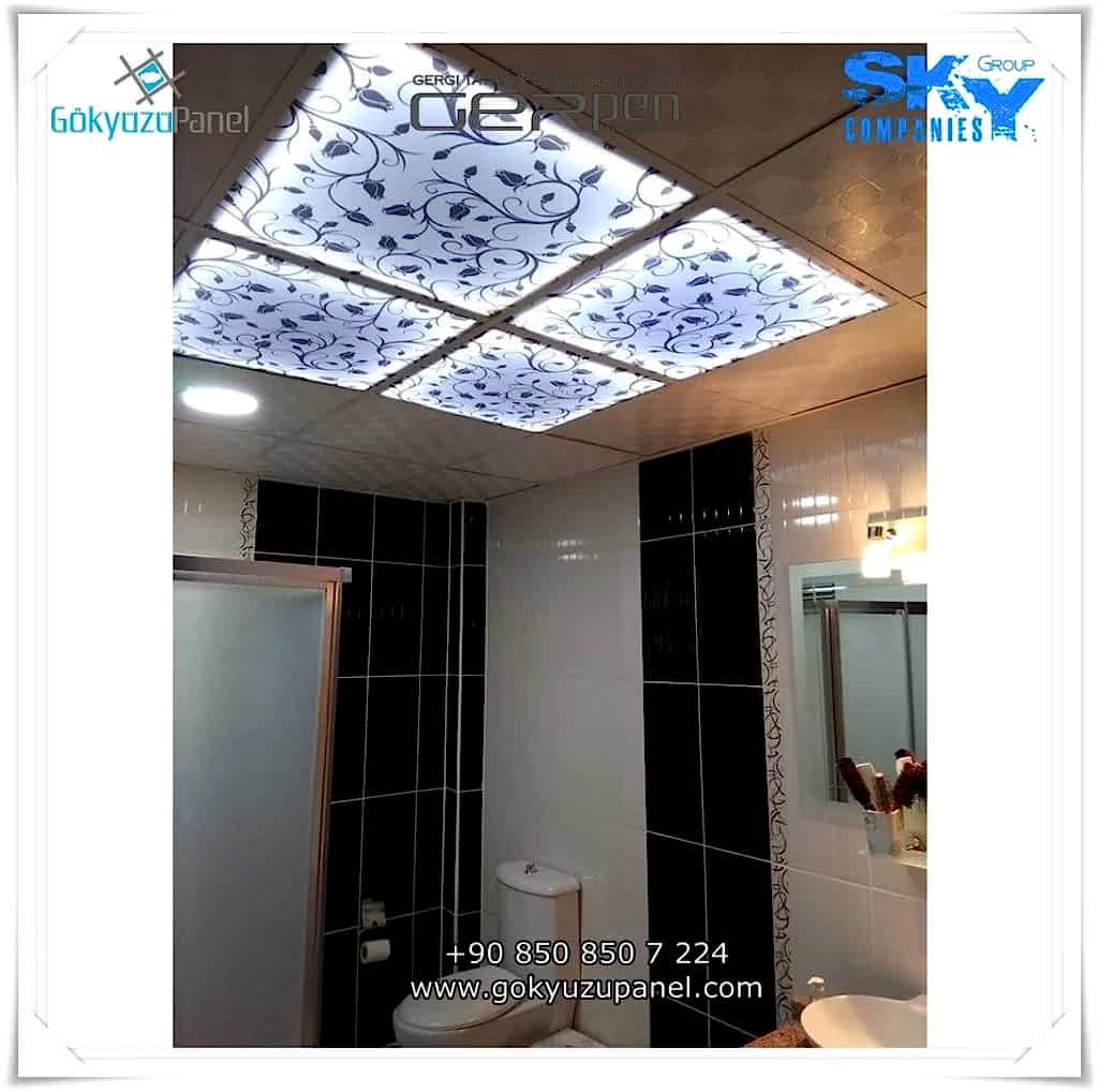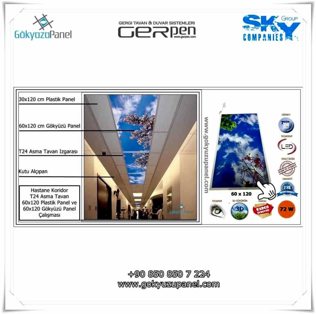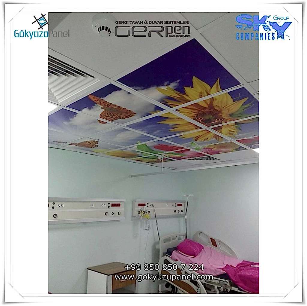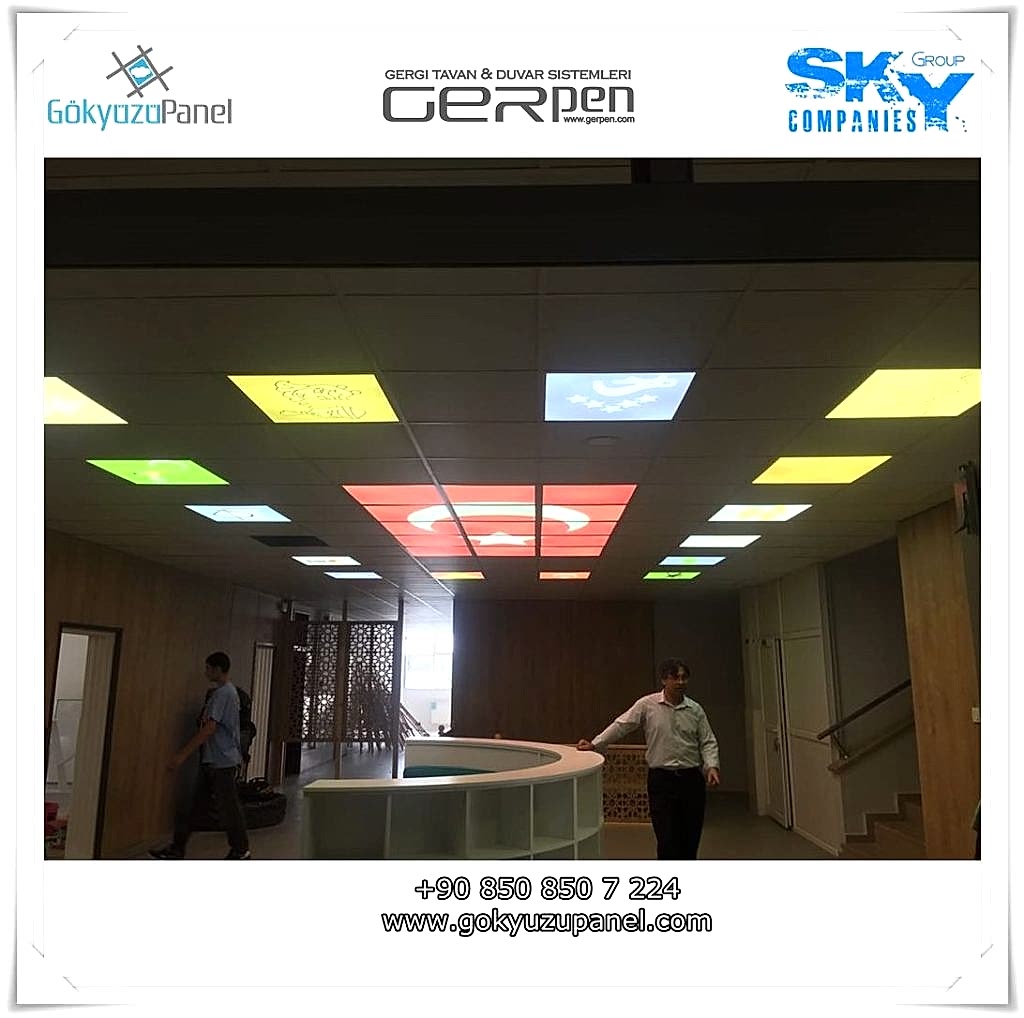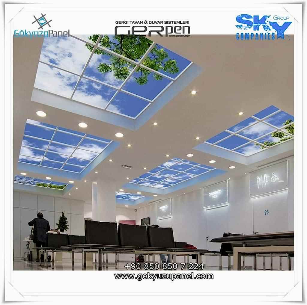 Gökyüzü Panel ürünlerinde ise durum tamamen farklıdır. Mevcut T24 taş yünü asma tavan sistemlerine ( sıva altı ) birebir uyum sağlar. 60×60, 60×120, 30×30, 30×60, 30×120, 15×120 gibi uluslararası asma tavan panelleri standart ölçülerine sahiptir. T24 Asma tavan ızgarası olmayan bölümlerde yine kutu alçıpan ile oluşturulan tavanlarda da kolayca kullanılabilir. Led Panel yapısı benzeri iç yanlardan led aydınlatmalı, homojen ışık dağılımı sunar. Böylece ışığı her santim de eşit alırsınız. Pleksiglas ön yüzeyi ve istenilen her görselin baskısının yapılabileceği sağlam, özel ve kullanışlı ürünlerdir. Montajı son derece basit olan bu ürünler sadece elektrik bağlantısına ihtiyaç duyar. Desen ve görseller her panel de özel ve ayrı olabileceği gibi birbirini takip eden puzzle şeklinde de oluşturulabilir. Oluşan kareli, dikdörtgen, oval ve benzeri puzzle görüntüler yapılan aydınlatma ve dekorasyona daha estetik bir görünüm kazandırır. Kullanım esnasında herhangi bir sorun yaşandığı zaman sorunlu panel çok kolay bir şekilde yenisi ile değiştirilebilir. Mevcut mekandan taşınma gibi durumlarda paneller çok kolay bir şekilde tavandan alınıp taşınabilir, yeni mekanda kullanılabilir.